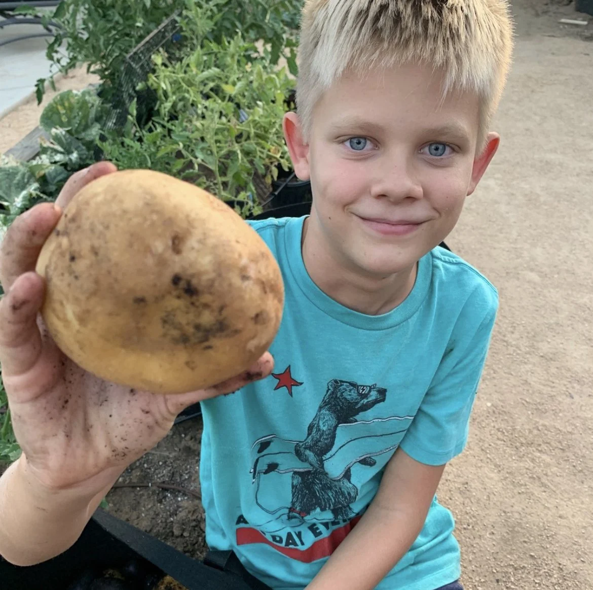 10. Dig out your beautiful potatoes. Kids love to help with this step! That’s it! Enjoy your harvest!